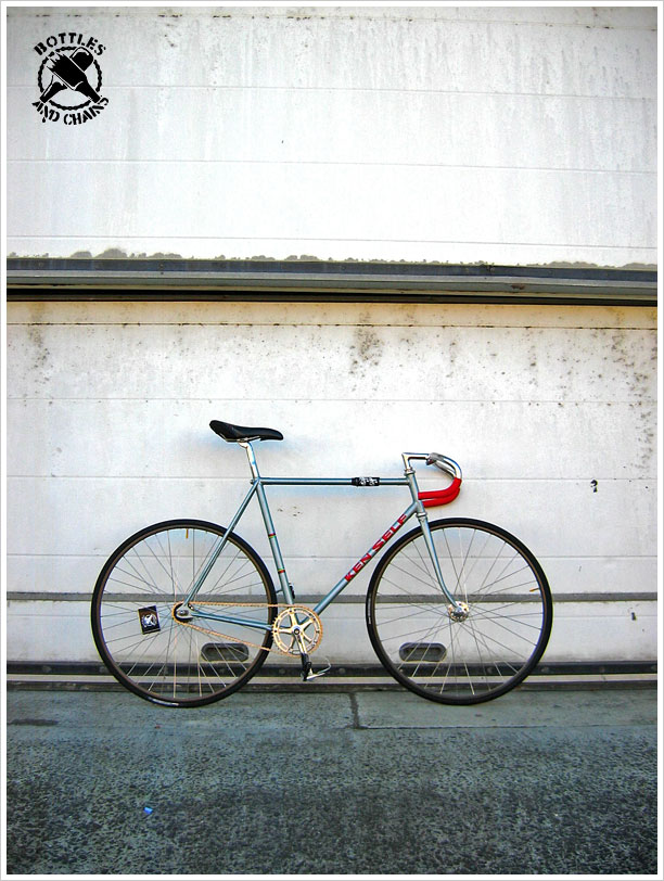 First ‘modern era’ fixed gear bicycle project. Frame was a Bundy roadie that I got for 50 bucks and resprayed. Kinesis alu forks just about shook the teeth out of my head. Bars were flipped and chopped chinese drops, which I painstakingly drilled so I could run the roadie brake levers un-reversed with internal cable routing. Wheels allegedly once belonged to Steven Pate (FWIW). Tri-style bottle cage arrangement was a short-lived experiment. Frame was too small but it served me well for about a year’s cummuting & JRA before a chainstay gave way to secret rust.