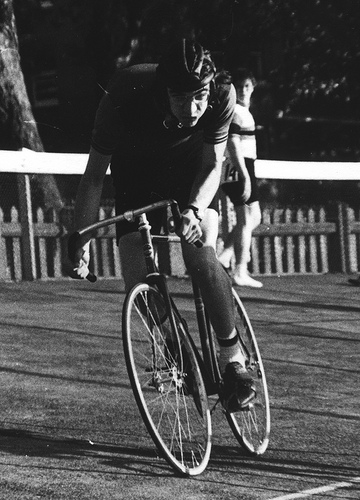 This is possibly my second “fixie” think it was a Witcomb, taken warming up at Paddington Track in London would have to be in about 1978, note the nylon (Nyflor) headset- Airlite Hubs (110 rear), singles of course- would be Clement 9’s. The chainset was a 151BCD - maybe mighty comp? Bars were narrow road ones- not good for sprinting. The shoes were Pete Salisbury, hand made- wonderful things, best I ever had with old nail on cleats. Not sure what the guy is doing behind me- but that is the steepest part of the banking!