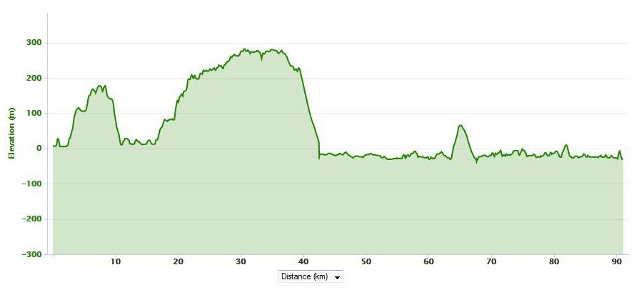 Distance checks out at 91km, with about 1000meters of climbing overall.